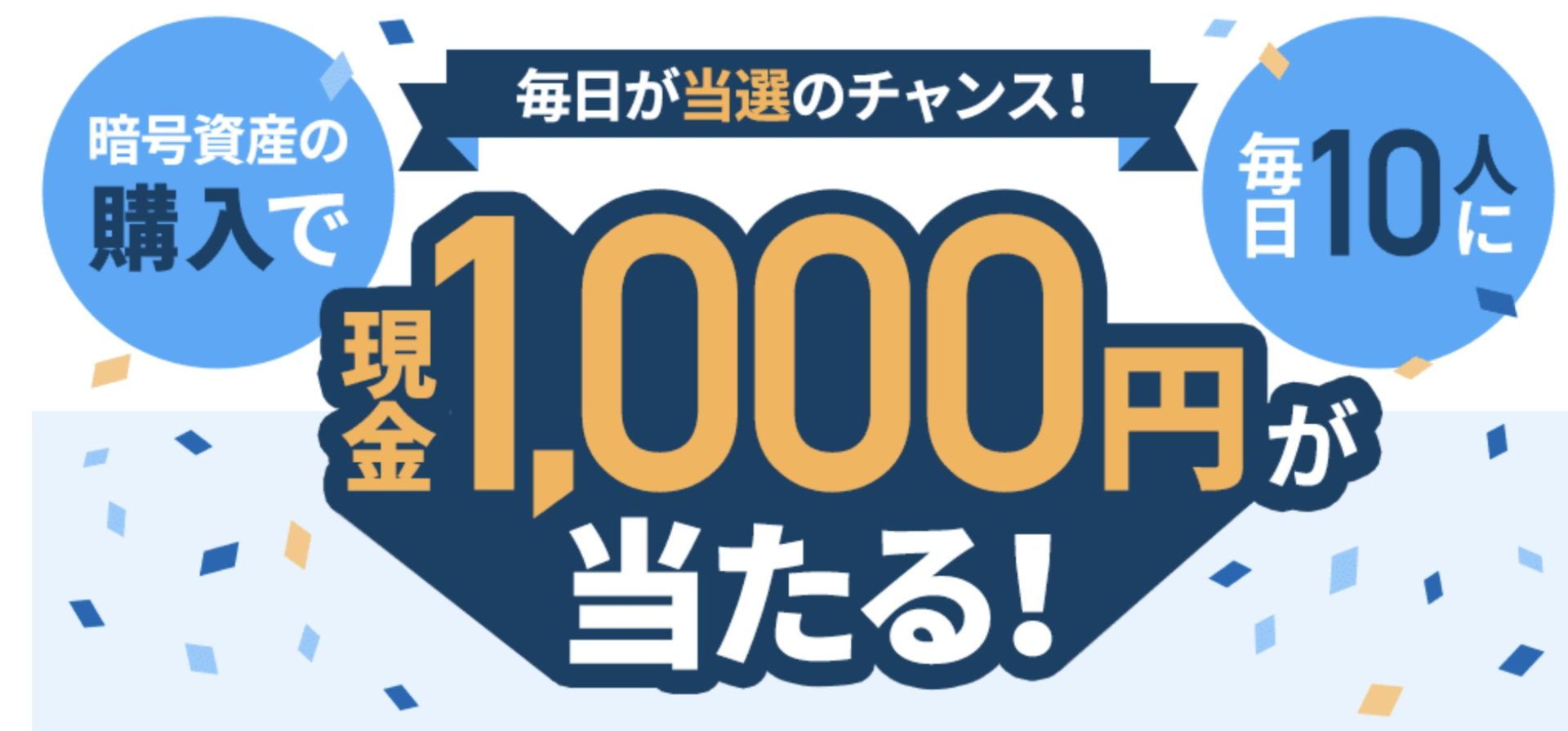 合計500円以上購入、または「つみたて暗号資産」において暗号資産(仮想通貨)を1回以上購入されたお客さまの中から毎日抽選で10名様に現金1,000円をプレゼント