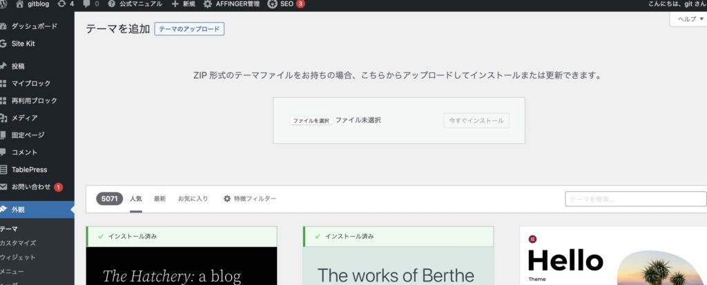 「外観」⇨「テーマ」⇨「ファイルを選択」でインストール画面に。