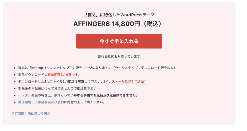 早速、AFFINGER6を購入しましょう。「今すぐ手に入れる」をクリック!で購入手続きが開始です。