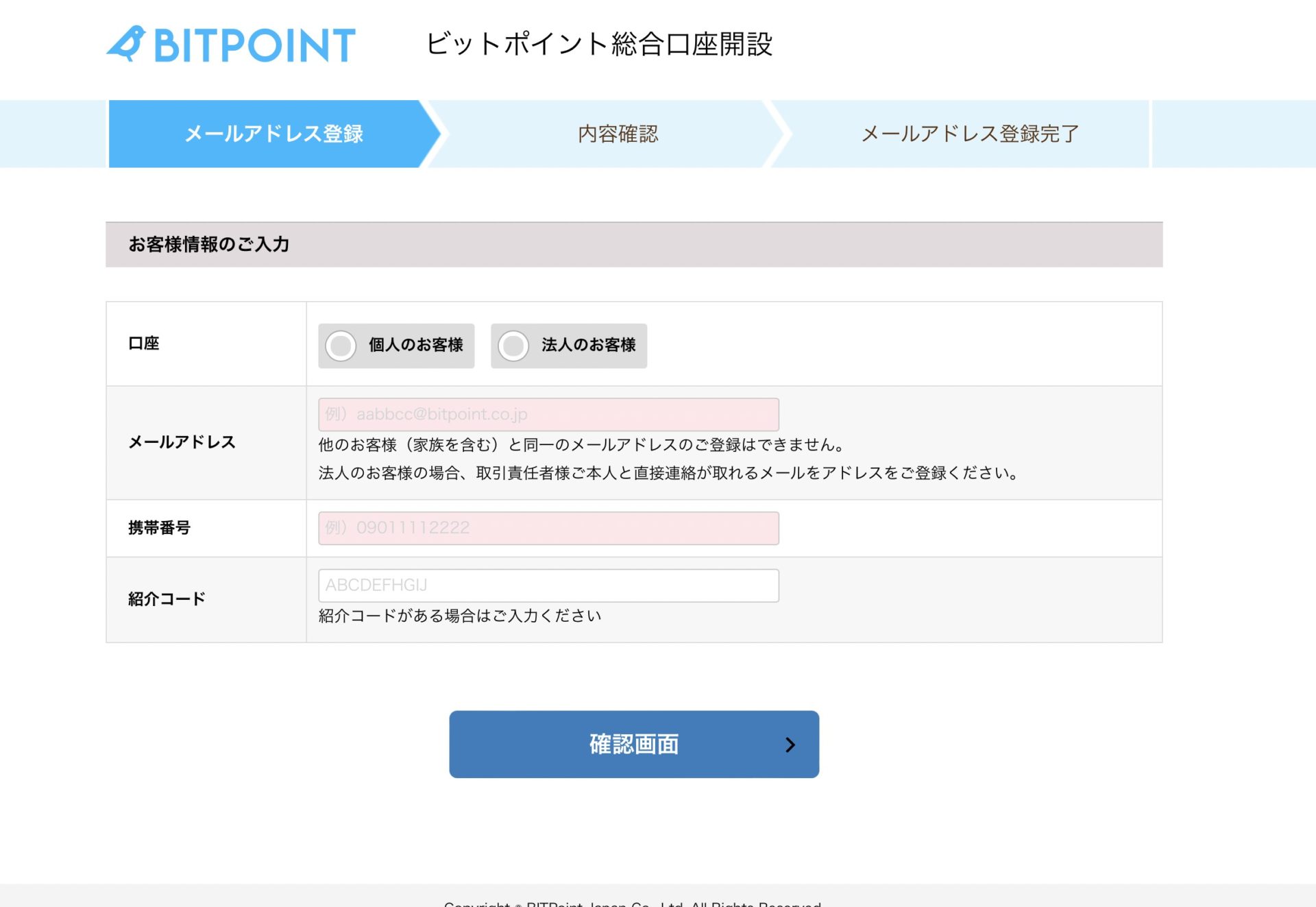 口座、メールアドレス、携帯電話番号、紹介コード(あれば)を入力し、「確認画面」をクリックします。