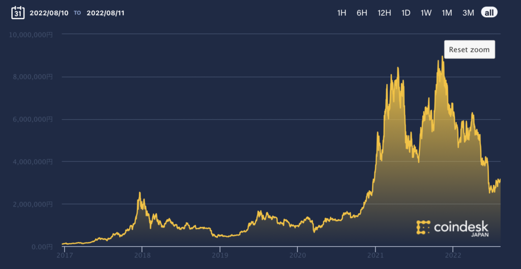 これはビットコインの価格変動のグラフになります。2021年11月には最高値で約780万円まで価値が上がりました。