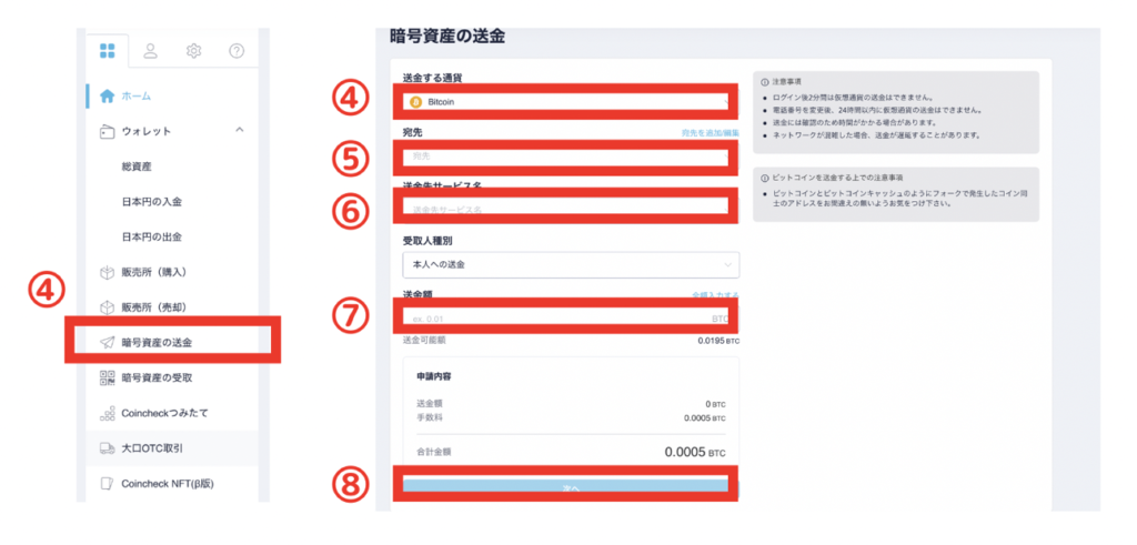 ④コインチェックにアクセスし、暗号通貨の送金をクリック