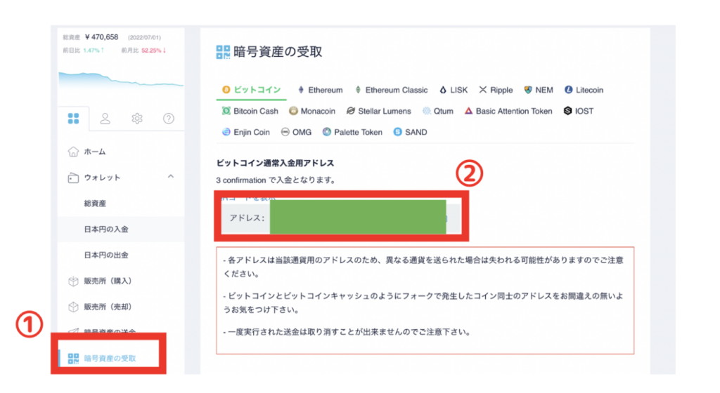 ①コインチェックにログインして、暗号資産の受取をクリック