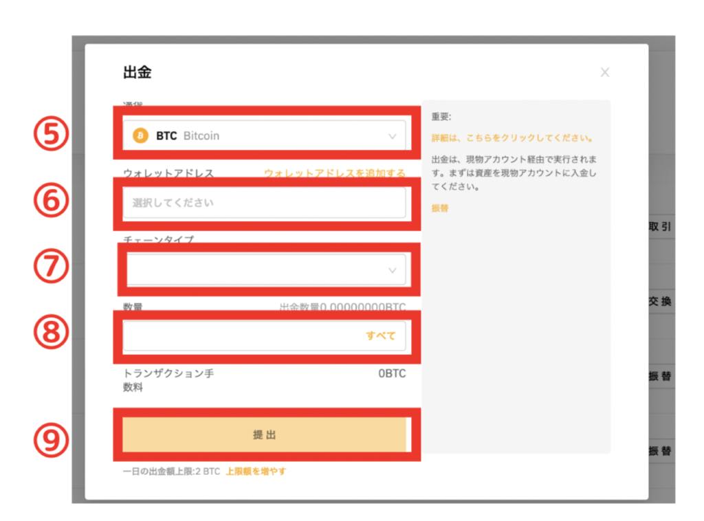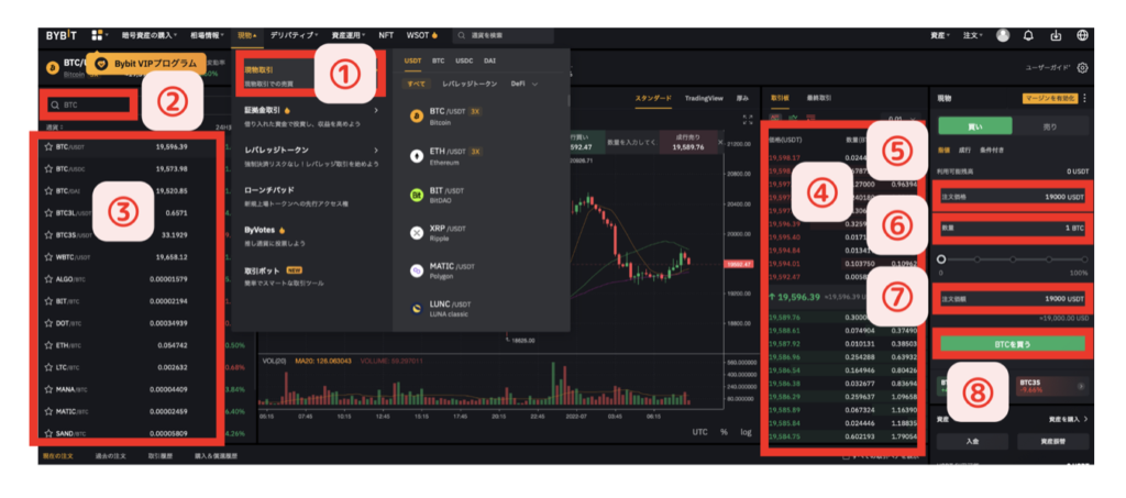 ⑧BTC(通貨)を買う(売る)をクリック