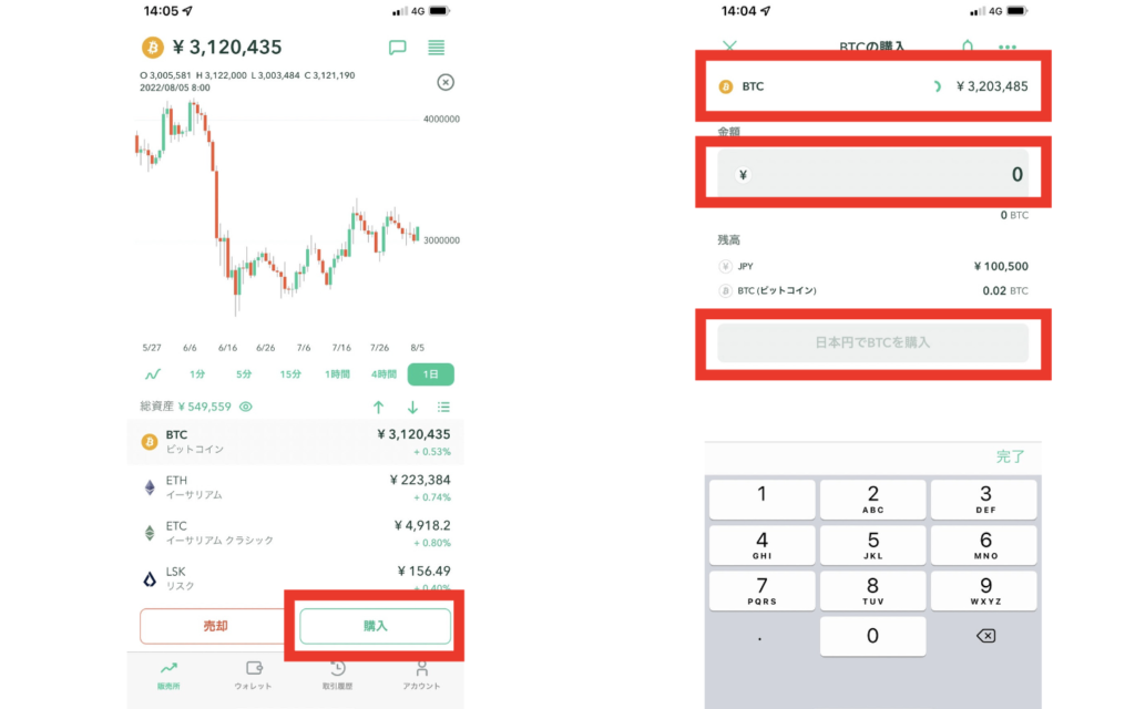 入金ができたら仮想通貨を購入していきます。アプリで簡単に購入ができ、かなり分かりやすいです。
