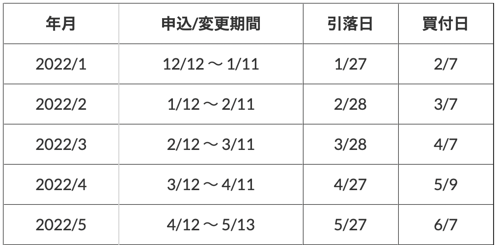 例えば、2022年5月1日に申請すると、銀行引き落とし日が5/27、買付日が6/7と翌月になってしまいます。