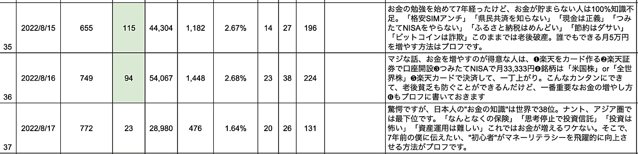 これを取ることで、「どんなトピックが伸びやすいのか?」「どのツイートがフォロワー獲得しやすいのか?」「どのツイートが反応されやすいのか?」