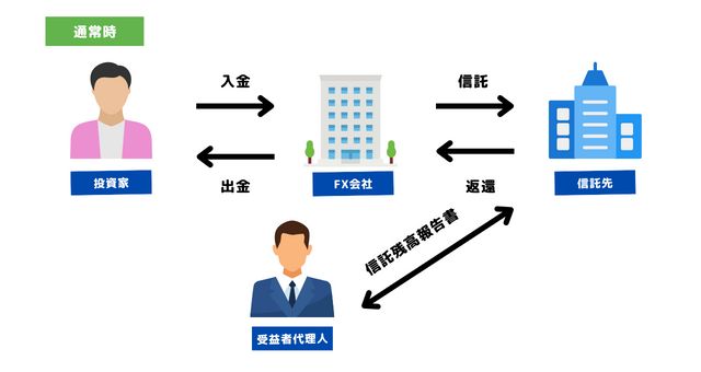 これは、「投資家の資金を守る」ため法律により義務付けられた制度であり、FX取引の途中業者が倒産や破綻しても事業継続された場合はそのまま取引可、継承されなかった場合も信託保全で資金は返還されます。