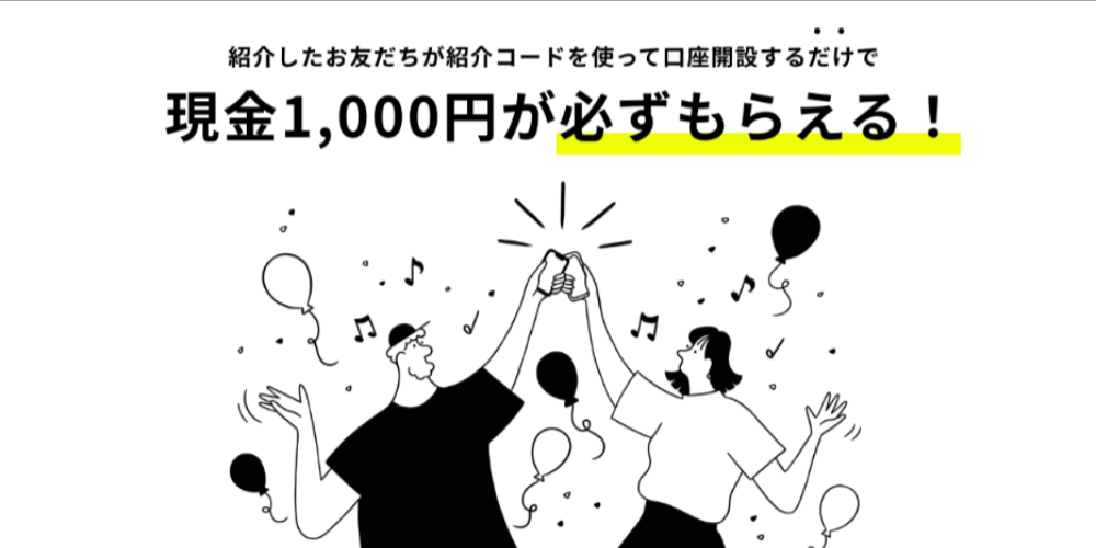 キャンペーン期間中(終了時期は未定)に、紹介コード入力を使って口座を開設すると、全員が1,000円獲得できます。