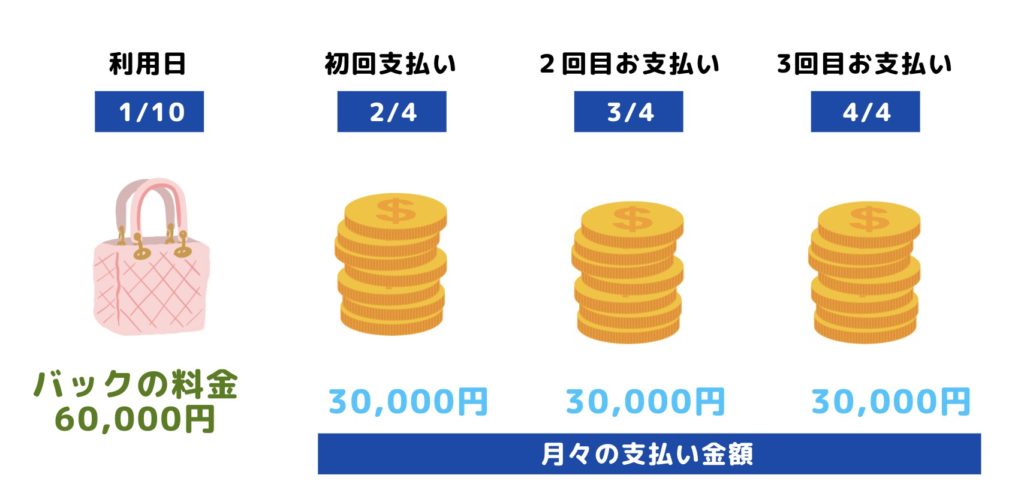 リボ払いとは、購入したものを一括ではなく、利子付きで分割で払うことです。