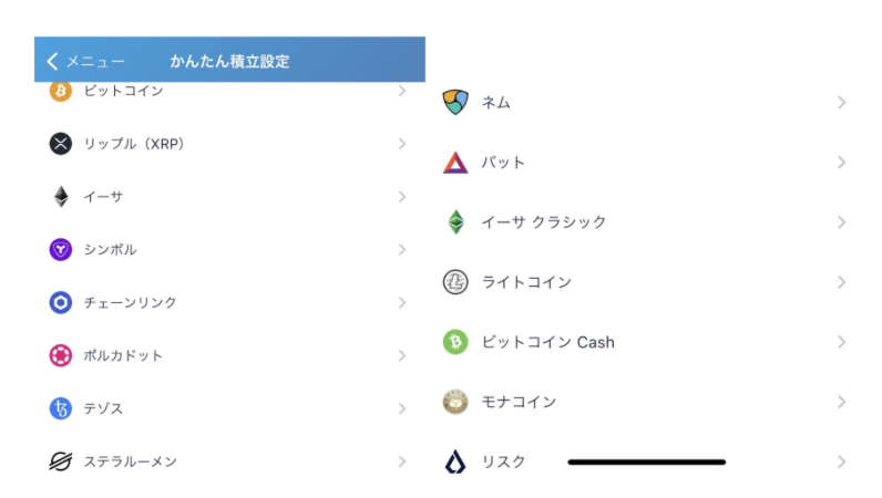 | 積立対象の仮想通貨 | ビットコイン、リップル、イーサリアム、モナコイン、テゾス、ステラルーメン、ネム、ベーシックアテンショントークン、イーサリアムクラシック、ライトコイン、ビットコインキャッシュ、リスク、ポルカドット、チェーンリンク、メイカー、ポリゴン、シンボル、ジパングコイン、フレア、シバイヌ、パレットトークン |